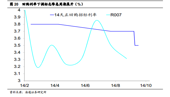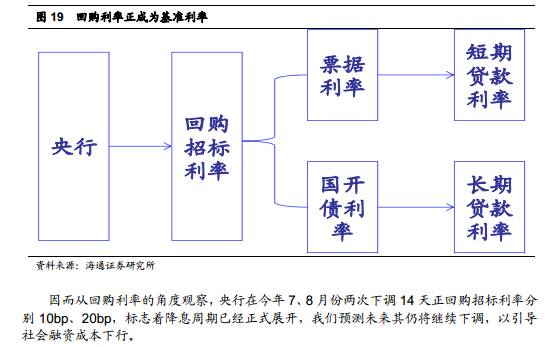 因而从回购利率的角度观察,央行在今年 7、 8 月份两次下调 14 天正回购招标利率分别 10bp、 20bp,标志着降息周期已经正式展开,我们预测未来其仍将继续下调,以引导社会融资成本下行。