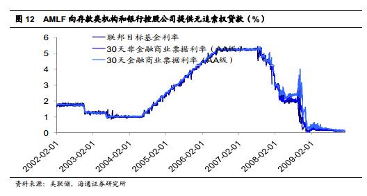 雷曼公司破产后,美联储推出 AMLF 绕道支持商业票据市场。大量投资者纷纷从货币市场共同基金撤资,被抽离的资金又不可能在短期内重返商业票据市场。 2008 年 9 月19 日,美联储宣布推出资产支持商业票据货币市场共同基金流动性工具( Asset -BackedCommercial Paper Money Market Fund Liquidity Facility, AMLF), 以贴现率向储蓄机构和银行控股公司提供无追索权贷款,为其从货币市场共同基金处购买资产支持商业票据提供融资,旨在帮助持有资产抵押商业票据的货币基金满足其投资者赎回的要求。