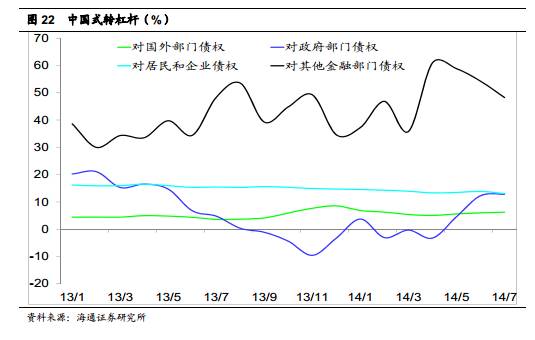 从今年以来中国广义货币增速 M2 的分解来看,来自居民企业部门的信贷以及来自出口部门的外汇持续萎缩,而来自于政府和金融部门的债权在持续扩张,也印证中国经济进入到转杠杆模式,未来产能过剩的经济部门将持续去杠杆,而政府和金融部门在央行低利率和量宽的支持下仍将加杠杆。