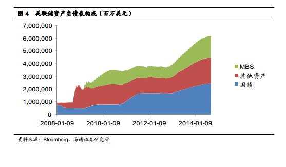 在去年年底美联储开始启动削减 QE 前,美国国债、 MBS 及一部分联邦机构债券三项合计已经占美联储总资产的比重高达 93%,其中美国国债和 MBS 已成为美联储最重要的资产类别,分别占 50%和 30%以上。