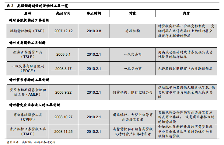 此外,美联储等也从四个方面,新创设了诸多流动性工具:第一类是针对存款机构的工具创新,另一类是针对交易商的工具创新,第三类是针对货币市场的工具创新,第四类是直接针对特定的具有系统风险的企业和法人的。