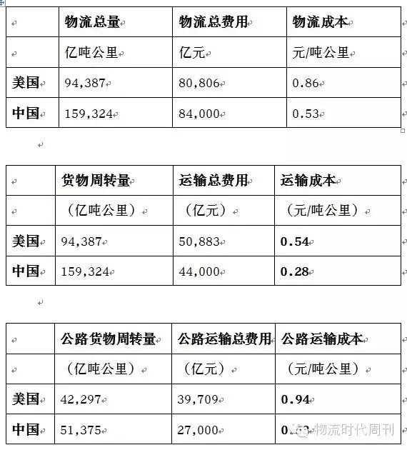 据美国交通运输部(DOT)和中国国家统计局2011年的公开数据计算,美国的物流成本、运输成本和公路运输成本分别是中国的1.62倍、1.95倍和1.79倍。中国和美国每吨公里的物流成本分别是0.53元和0.86元、运输成本分别是0.28元和0.54元,公路运输成本分别是0.53元和0.94元。
