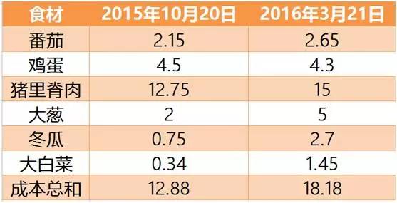 近来,蔬菜和猪肉价格不断上涨,眼下大白菜不再是“白菜价”,猪肉的批发价格也比去年3月上涨了六成以上。据每日经济新闻报道,以番茄炒蛋、京酱肉丝、油焖冬瓜,白菜汤这一桌三菜一汤计算:从去年10月20日到今年3月21日短短5个月时间,这一桌家常菜的成本从12.88元上升到18.18元,涨幅超过40%。