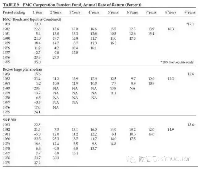 投资业绩属于FMC公司退休基金,我本人没有管理过这家基金的一分钱,但我的确在1974年影响了他们的决策,说服他们选择以价值为导向的基金经理。在此之前,他们采取与其他大型企业相同的方式来选择基金经理。在他们转向价值投资策略之后,其投资业绩目前在贝克退休基金调查报告(the Becker survey of pension funds)中超越其他同等规模基金而名列第一。1983年时,该基金共有8位任职1年以上的基金经理,其中7位累积投资业绩超过标准普尔指数。在此期 间,FMC基金的实际业绩表现与基金平均业绩表现的净回报差额是2.43亿美元,FMC将此归功于他们与众不同的基金经理选择倾向,这些基金经理未必会是我个人中意的选择,但他们都具有一个共同的特点,即基于价值来选择股票。