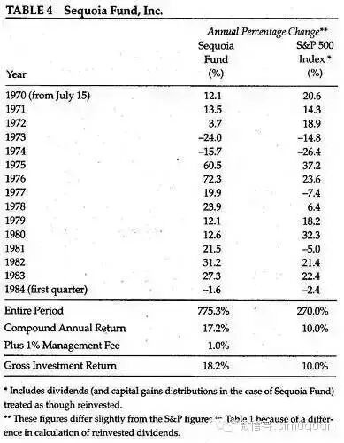 红杉基金(the Sequoia Fund)的投资业绩记录,该基金经理是比尔鲁安(Bill Ruane),1951年我们在格雷厄姆的课程中结识。他从哈佛商学院毕业后进入华尔街工作,他在工作中意识到自己需要接受一种真正的商业教育,于是报名参加了格雷厄姆在哥伦比亚大学的投资课程,1951年年初我们正是在那里相识。从1951年到1970年间,比尔所管理的资金规模相对于平均水平而言小得多,但投资业绩却远远超过平均水平。当我结束巴菲特合伙公司时,我问鲁安能否成立一家基金公司以吸收巴菲特合伙公司原来合伙人的资金,于是他就设立了红杉基金。他设立这只基金的时候恰恰在我结束合伙公司之时,这是一个非常糟糕的市场时机。他正好碰上了一个双重市场,并且遭遇了价值投资者相对业绩表现非常差劲的困难时期。我非常高兴地说,我原来的合伙人不但继续与他相守,而且追加了更多的资金,他取得如此优秀的投资业绩,当然让基金持有人非常满意。
