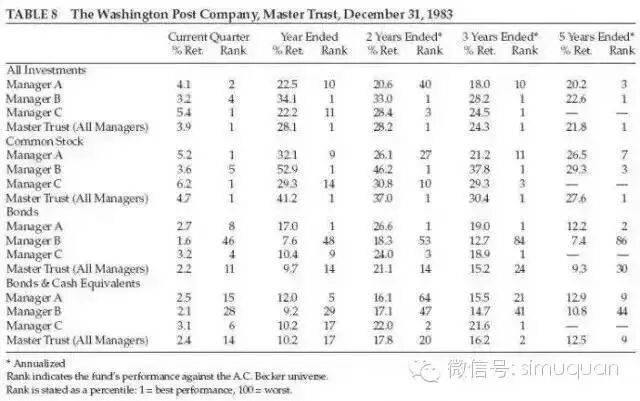 正如你在投资记录中所看到的那样,从他们更换基金经理之后,其整体投资业绩在所有基金中一直名列前茅。华盛顿邮报公司要求基金经理人至少保持25%的资金投资于债券,而债券未必是基金经理人的投资选择。因此,我在表中也将其债券投资业绩包括在内,而这些数据表明他们其实并没有什么特别的债券专业技巧,他们也从未这样吹嘘过自己,虽然有25%的资金投资于他们所不擅长的债券领域,从而拖累了他们的投资业绩,但其基金管理业绩水平仍然名列前一百名之内。华盛顿邮报公司退休基金的投资尽管并没有经过一个很长的市场低迷时期的考验,但仍然足以证明三位基金经理的许多投资决策并非后见之明。