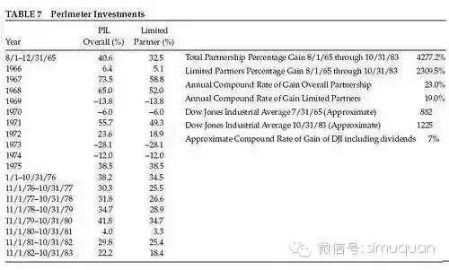 斯坦﹒波尔米塔(Stan Perlmeter)的投资业绩记录。他毕业于密西根大学艺术系,是波泽尔﹒雅各布斯(Bozell& Jacobs)广告公司的合伙人之一。我和他的办公室恰好位于奥马哈市的同一栋大楼。1965年,他发现我所从事的投资业比他从事的广告业前景更好,于是他离开了广告业。与李克﹒古瑞恩一样,斯坦﹒波尔米塔在五分钟之内就完全接受了价值投资理念。