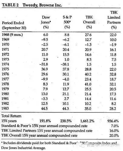 1986年,汤姆-科拿普与同样是格雷厄姆信徒的艾德-安德森(Ed Anderson)以及其他几位有共同投资理念的人合伙组建了特维帝-布朗合伙公司(Tweedy, Browne Partners),他们的投资业绩见表2。该公司取得以上投资记录的方式是进行高度分散化的投资组合,他们偶尔也会并购企业取得控制权,但其被动式投资业绩与控制权投资的业绩基本相同。