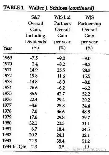 第一个案例(见表1)是沃特﹒斯科劳斯(Walter Schloss)的投资记录。