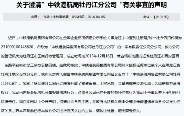 坊间传言,不法分子冒用龙江银行名义办理商业承兑汇票,商票主体是“中铁港航”。不过,4月5日,中铁港航局发布了一份关于澄清”中铁港航局牡丹江分公司“有关事宜的声明: