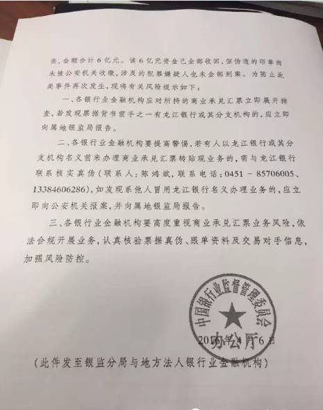 通知要求,各银行业金融机构应对所持有的商业承兑汇票立即展开排查,若发现票据背书前手之一有龙江银行或其分支机构的,应立即向属地银监局报告。