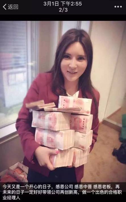 e租宝美女总裁的张敏,获得了老板丁宁赠予的上亿房产和数亿现金,中晋系的倒台也源自一位美女炫富惹的祸。这位美女副总裁,有一辆加利福尼亚T、一部总裁版玛莎拉蒂、一辆mini,三辆车是两年内买的,国内还有多处房产,在深圳还有别墅。
