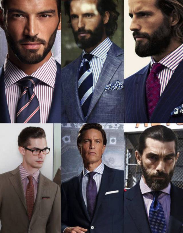 选择细条纹衬衫时,领带图案就应该要选择宽版条纹,或是波卡圆点。同样的原则,选择间距较大的条纹衬衫时,领带就可以是密集小圆点或是细格纹图案,这样不同大小的图案让人在视觉上看起来比较有层次感。