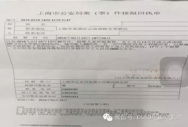 戚全出示的豫园派出所接报案回执单显示,他17日上午报警后,发现事发时放在8615号房内行李箱中的现金少了2800元左右。