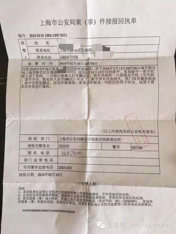 戚全提供的接报案回执单显示,2月16日,他向南京西路派出所报案称,2月13日离开位于上海市世鹿路某处的暂住地,直到2月15日12时回到家中,发现一只旅行箱被人翻过,里面一部手机丢失,家中没有其他损失,房门无撬窃痕迹。戚全怀疑是陈海所为,陈海曾对其进行过多次骚扰。