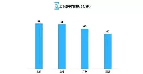整体来看,北京平均上班要52分钟,上海要51分钟,差异不是很大,广州需46分钟,深圳得40分钟。