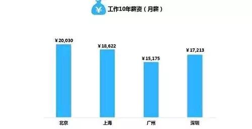 生活在大城市看的见的未来是最大的动力,那么10年后工资会有多少呢?统计显示,北上广深工作10年可以拿到的月薪如下图,北京为2万,上海1万8,广州最少,平均薪水在1万5左右。