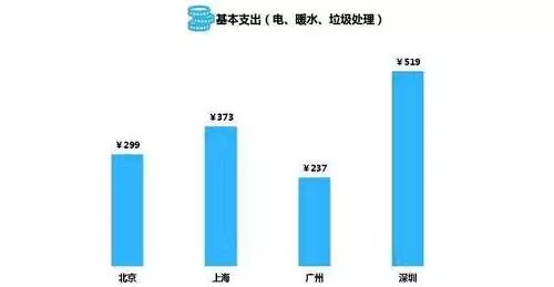 四大城市基本住房支出中,电费、水费、暖气费、垃圾处理等费用月支出均高于200元,深圳以519元居于首位。