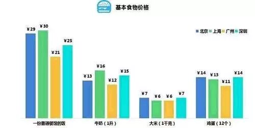 一日三餐是生活中再小不过的事了,但大城市中一顿饭也并不便宜,平均来看,上海、北京都约为30元,价格最低的广州也要21元。除此,牛奶、大米、鸡蛋等日常基本食物中,广州的价钱也最低。