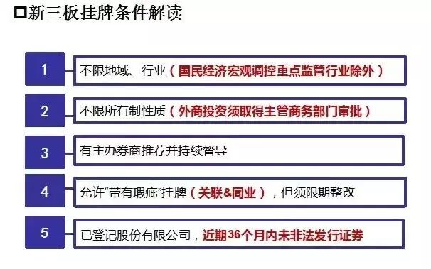 在A股上,要求企业是非常清爽的、没有任何问题的。但新三板针对的主要就是中小型企业。中小民营企业以往总是会存在这些那些的问题,这些问题是客观存在的,有的还不是短期内能解决的。比如有的老板当年收购了一家国有企业,但在处理产权的时候处理不干净。或者其实是处理干净了,但因为发改委政策的更改,又变得不合格、不规范了。这个政策更新又不会一对一通知企业,你自己发现的时候可能过了两三年了,改就不好改了。就造成了企业存在瑕疵问题。那么现在是允许企业有一些瑕疵,由律师向公众披露,企业承诺限期整改。还有就是关联交易的条件是放宽了,但同业竞争方面,目前从2300多家挂牌企业情况来看,同业竞争,还是一票否决的。