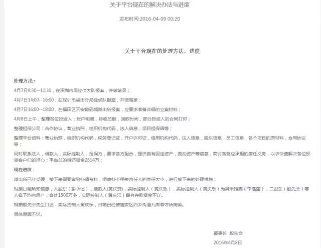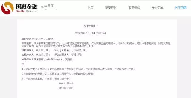 紧接着,4月9日凌晨,国惠金融董事长殷先会发布两则公告。公告显示,国惠金融公司与其担保公司的实际控制人相同,均为黄庆乐,其以弟弟黄庆贺的名义,作为平台借款人进行收款,并提现使用。殷先会告诉深圳卫视记者,并不知道这些人在搞自融,否则不会加入。而在发现平台的问题后,他已向警方报案。
