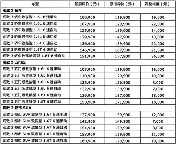 2016年,车市从春节后开始降价了。2月22日,观致汽车宣布旗下观致3、观致3五门版以及观致3都市SUV车型全系下调官方指导价,下调幅度最高达到2.6万元。此次降价后,观致3的整体售价区间从11.99万元-17.79万元下调到了10.09万元-15.19万元。