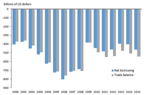 注:蓝色柱子代表净借款额,灰色柱子代表贸易差额;负值代表净借款,贸易差额反映的是经常账户差额,不包括投资收入。