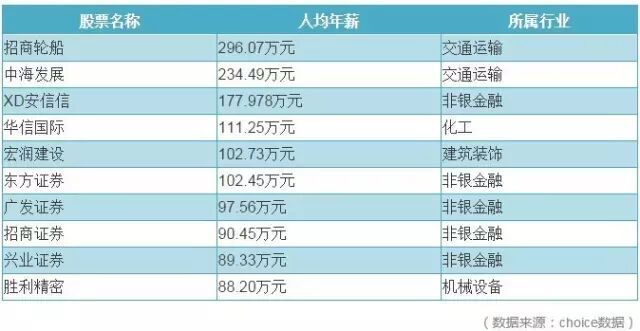 年薪最高的两家均为交通运输行业,招商轮船人均年薪296.07万元,而证券业最高工资东方证券,人均年薪102.73万元。只有招商轮船的三分之一。