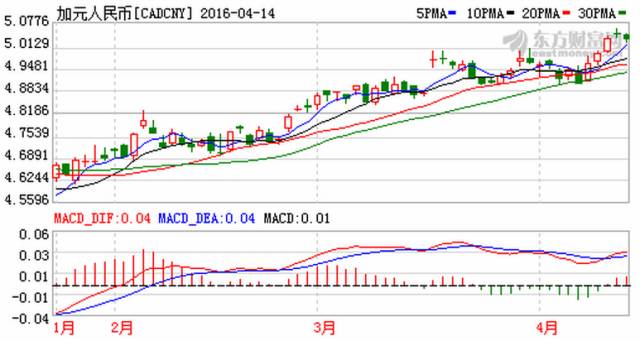 下面是加元对人民币汇率走势,人民币在贬值(上升代表贬值,下同):