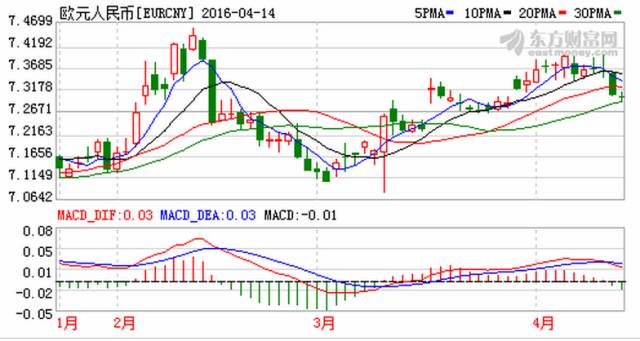 下面这张图显示的是欧元对人民币汇率,上升代表人民币贬值。可以看出,3月以来,人民币对欧元是贬值的。