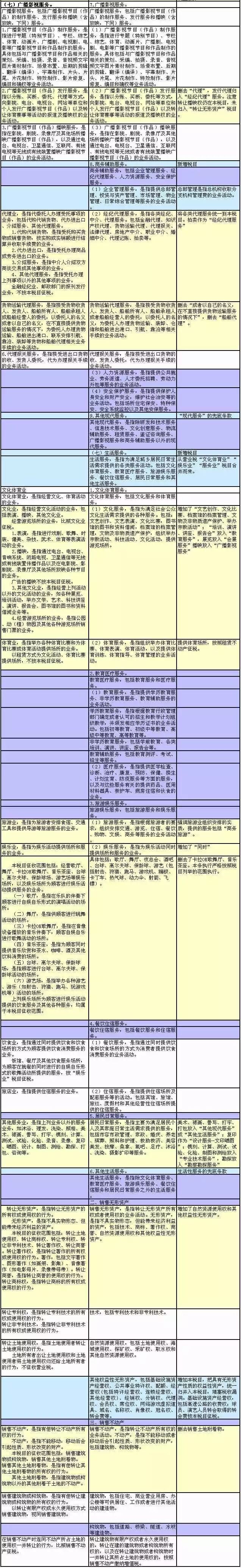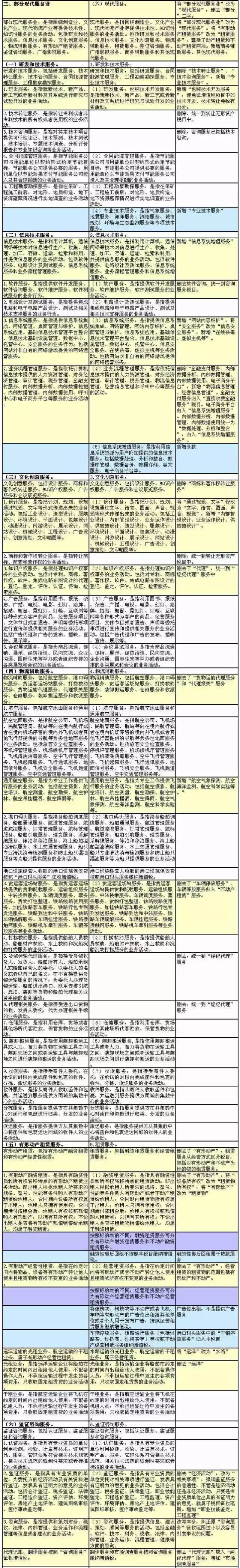 5月1日起,营改增在最后四个行业全面推开。财政部、税务总局发布了《关于全面推开营业税改征增值税试点的通知》,税目注释有哪些变化?新旧对照