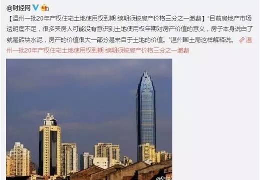 浙江温州最近出现一部分市民,他们正常买卖二手房后却无法完成交易,原因是土地到期了。如果要续期,必须缴纳占房价总额约三分之一的土地出让金。其中,不少市民发现,他们持有的土地证上写着土地年限20年到期。