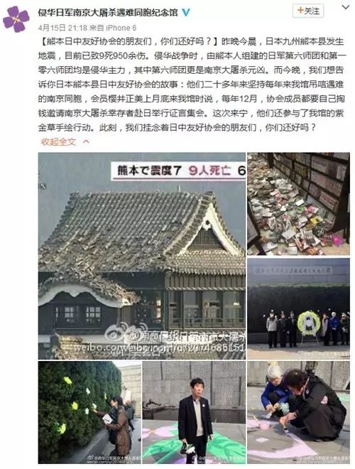 4月15日晚,侵华日军南京大屠杀遇难同胞纪念馆发微博慰问日本熊本日中友好协会。该微博写道:“昨晚今晨,日本九州熊本县发生地震,目前已致9死950余伤。侵华战争时,由熊本人组建的日军第六师团和第一零六师团均是侵华主力,其中第六师团更是南京大屠杀元凶。而今晚,我们想告诉你日本熊本县日中友好协会的故事:他们二十多年来坚持每年来我馆吊唁遇难的南京同胞,会员樱井正美上月底来我馆时说,每年12月,协会成员都要自己掏钱邀请南京大屠杀幸存者赴日举行证言集会。这次来宁,他们还参与了我馆的紫金草手绘行动。此刻,我们挂念着日中友好协会的朋友们,你们还好吗?”