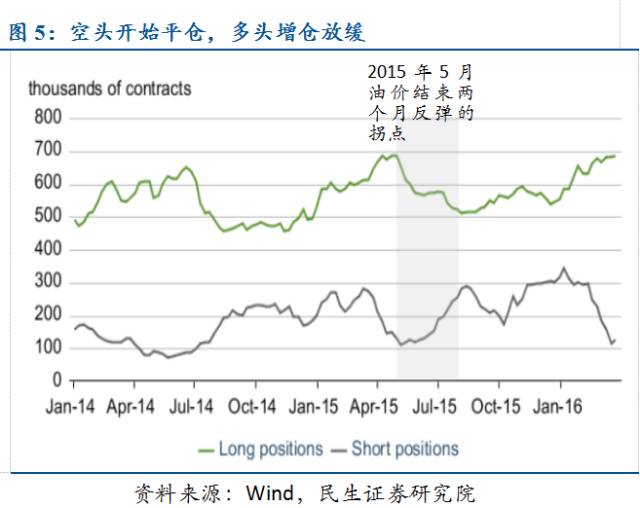 期货市场是直接决定油价的最前沿阵地,1月下旬以来的油价上涨50%,首先造成了远期升水大幅降低,已经接近15年年中以来的最低值,未来将会对当期合约价格有较大下行压力;其次使得多头合约数达到过去两年高位而空头合约数急剧减少,目前多头持仓增长趋势已经放缓,而空头持仓已经有初步反转趋势,综合来看,短期内油价面临调整压力。