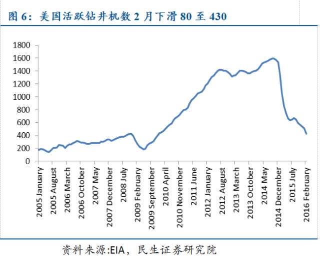美国活跃钻井机数快速下滑,产量持续下降。EIA最新数据显示,美国2月钻井机数下滑80至430,连续16个月下滑;3月原油产量为9百万桶/天,略低于2月,同时下调美国2016年产量0.1百万桶/天至8.6百万桶/天(2015为9.4)。