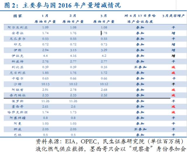 未来关注点?伊朗的增产,美国页岩油的减产及沙特将于4月25日宣布的综合计划2、3月来看,只有伊朗还在进行较大规模的增产,年内还有0.7百万桶/天的增量空间,其未来是否妥协参与冻产以及复产恢复的节奏至关重要;此轮历时两年的油价调整背后核心是页岩油新技术的冲击,未来美国页岩油的低油价忍受力以及产量减少情况需要密切关注,EIA预计2016年美国产量降低0.8百万桶/天至8.6百万桶/天;沙特王储今日表示,沙特将于4月25日宣布一项综合计划来应对“后石油时代”危机,目前综合计划对内对外尚不得之,但考虑到多哈会议前夜,沙特曾放下狠话要挟其余产油国说其有能力立即增产1百万桶/天,未来需要密切关注。