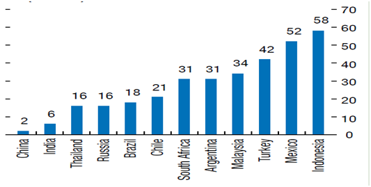 图7 部分新兴市场国家外国投资者持有的主权债比例(%)