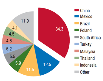 未来,开放的中国债券和股票市场对全球资产配置将产生重大影响。如今,中国债券市场是全球第三大的资本化市场,其市值为6.7万亿美元,过去五年中,它以年均22%的速度增长(图5)。在2015年之前,债券市场并不对海外投资者开放;2015年起,各国央行和主权财富基金才被允许在该市场投资。随着债券市场的进一步开放,各国央行或将把更多的外汇储备配置在中国债券上(图6),各国私人投资规模增长潜力大(图7)。这可能对全球资产配置和新兴市场经济金融市场有重要影响。根据IMF工作人员测算,如果将中国债券纳入J.P. Morgan新兴市场体债券指数,中国的权重或将接近34.3%(图8)。如果将A股纳入全球股票指数,在MSCI新兴市场指数中其权重将接近10%。