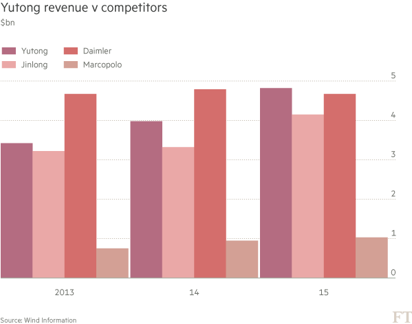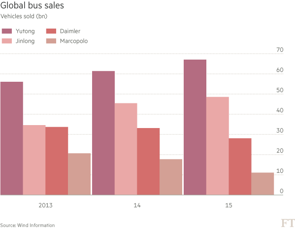 与此相对应,万得资讯(Wind Information)的数据显示,从2014年到2015年,中国客车销量从60.4万辆下降至59.8万辆。与其他许多利润依赖国内市场的中国公司一样,宇通将这视为更大力拓展海外市场的信号。