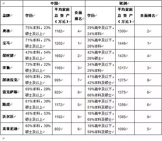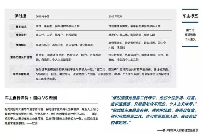 从事职业以中层职业经理人、私营业主和公务员为主。欧洲各职业分布平均,自由职业者、全职太太、退休等车主的比例显著高于国内车主。平均家庭月收入将近9万元,低于欧洲三成,去年为8.8万元。认为自己自信、热情、坚强和热爱生活。运动取代旅游成为他们最主要的兴趣爱好。中国平均家庭总资产最高的三个品牌车主分别为保时捷、宝马、沃尔沃,欧洲为宝马、保时捷、沃尔沃。