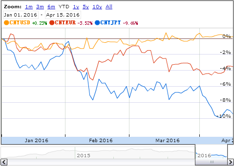 今年以来人民币对美元汇率几乎变化,却对欧元贬值近4%,对日元贬值近10%:
