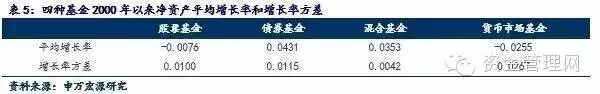 第一,债券基金已于2011年开始取代货币市场基金,成为全球净资产规模占比仅次于股票基金的资产管理产品种类。另外,从发展趋势和稳定性来看,债券基金的整体表现应该是最好的。结合表5,从净资产平均增长率看,债券基金最高,为0.0431,而股票基金和货币市场基金均为负数;从增长率方差看,债券基金虽然高于混合基金,但明显低于货币市场基金,且股票基金相差无几。