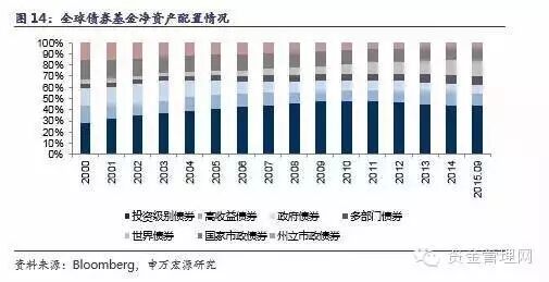 第二,在各类债券基金中,信用级别较高、违约风险较小的投资级别债券所吸收的资金量最大,且在2000-2011年之间保持持续上升趋势,随后虽出现小幅回落,但并不影响其绝对主导地位。