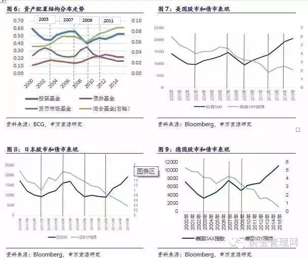(5)2009年-2011年:股债双牛在欧美和亚太多国出现,资金再次开始从货币市场基金、混合基金、结构化产品和另类投资转向股票基金和债券基金;被动管理型产品规模持续增长。