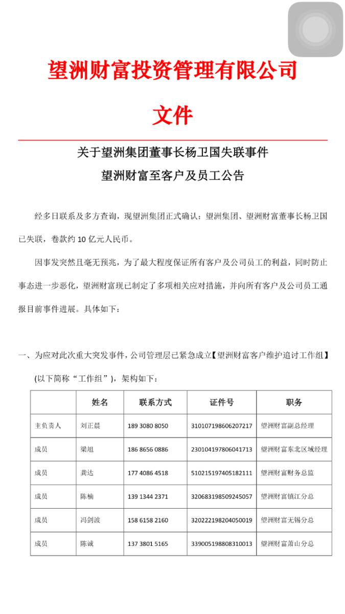 一份来自望洲财富投资管理有限公司的文件公告《关于望洲集团董事长杨卫国失联事件望洲财富至客户及员工公告》显示,经多日联系及多方查询,现望洲集团正式确认:望洲集团、望洲财富董事长杨卫国已失联,卷款约10亿元人民币。