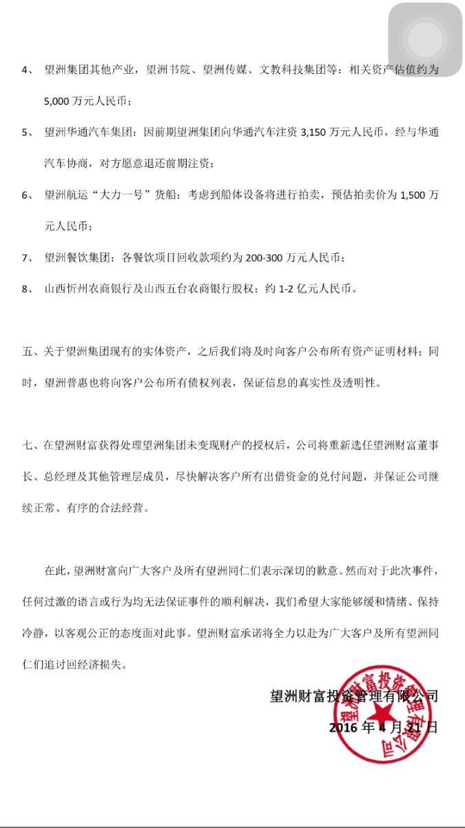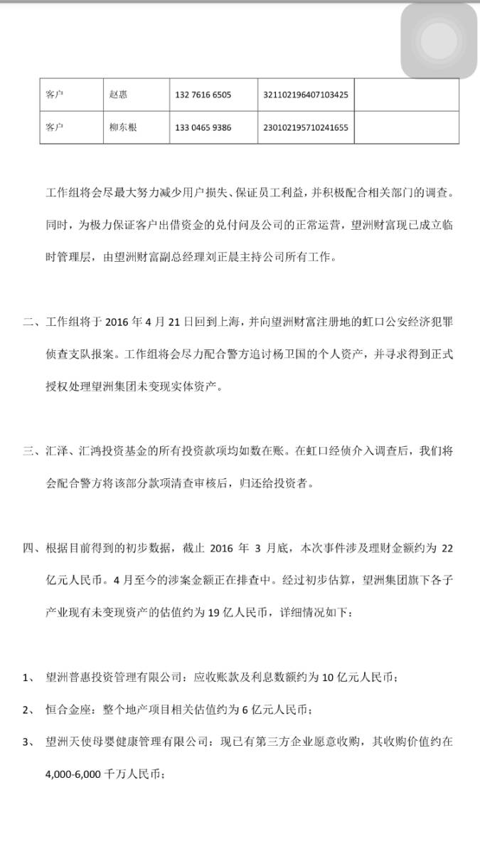 公告还显示,截至2016年3月底,事件涉及理财金额约为22亿元人民币。4月至今的涉案金额正在排查中。经初步估算,望洲集团旗下各子产业现有未变现资产估值约为19亿元人民币。