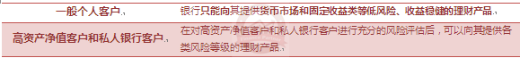 银行开展理财业务销售活动应按照风险匹配的原则,严格区分一般个人客户、高资产净值客户和私人银行客户,理财产品销售的分类管理进行,提供适应不同类型客户投资需求和风险承受能力的产品,严格风险自担。