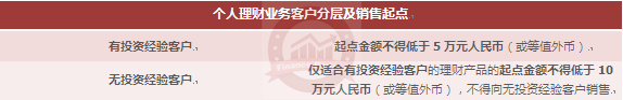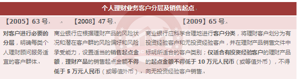 点评: 从【2005】63号规定保证收益理财计划的起点金额,人民币应在5万元以上,其他理财计划和投资产品的销售起点金额应不低于保证收益理财计划的起点金额到【2008】47号规定理财产品的销售起点金额不得低于5万元人民币,再到【2009】65号仅适合有投资经验客户的理财产品的起点金额不得低于10万元人民币(或等值外币),不得向无投资经验客户销售。新文件对于银行所有理财产品的销售起点进行了统一,且根据有无投资经验对客户设置不同销售起点。体现了政策对于有投资经验客户的高门槛准入和保护无经验投资者的原则,符合市场发展和风险防控的要求。