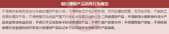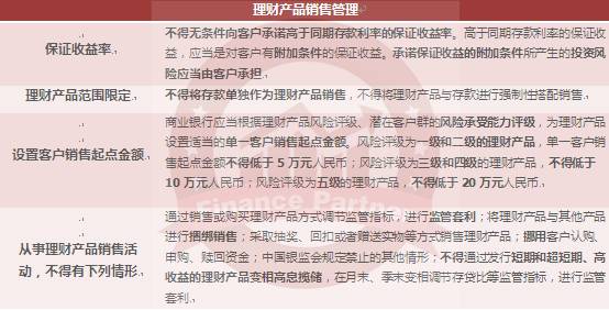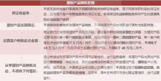 点评: 1、为高息揽储降温 A、存款与理财产品的划分一直是银行所关注的问题,此阶段主要针对存款能否作为理财产品销售又做出明确规定,严格区分了存贷业务与理财业务的界限,使理财产品的资金来源和资金运用相对应,独立于银行信贷业务。表内和表外业务隔离,防治存款借助理财业务高息揽储和侵犯存款客户合法权益,同时避免带来流动性等风险。 B、不得无条件向客户承诺高于同期存款利率的保证收益率;高于同期存款利率的保证收益,应当是对客户有附加条件的保证收益。保证收益率指在保证收益理财计划中,商业银行按照向客户承诺支付固定收益,或银行按照约定条件向客户承诺支付最低收益并承担相关风险。存款的利率也代表了客户的一种保证收益,与此类理财计划的保证收益极其相似,无条件承诺高于同期存款利率的保证收益率,说明理财产品较强高息揽储的动机。 C、不得通过发行短期和超短期、高收益的理财产品变相高息揽储。因为此期限段产品存在“高息揽存”和无真实投资的问题。此后,少数大中型银行开始转变运作模式,逐步向产品和资产组合一一对应的模式过渡,但仍有众多中小型银行在效仿并采用这种模式。鉴于此,监管层于2013年初开始对各大商业银行“资产池”理财产品进行现场检查。此类措施已进入监管第四阶段。 2、风险评级 理财产品销售管理要求银行为理财产品按照五级分类原则,并设置适当的单一客户销售起点金额。这是银监会首次对银行理财产品各级销售门槛提出统一要求,五级分类原则是一个新概念。其实在此前,各家银行在销售理财产品时,实际已按照产品不同风险设定了不同的客户准入标准。客户准备标准的分级设定,首先考虑的肯定是风险问题,能够达到5万门槛的客户被认为是对风险认识更高,所以银监会要求银行通过这个分级门槛来筛选出风险承受能力更高的客户,以控制每级客户的流动性风险。