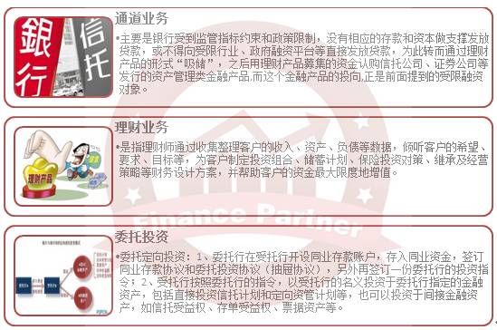 银行资产管理主要分为3大业务:通道业务、理财业务和委托投资业务通道类业务,其中通道业务主要包括银信、银证、银基和银保通道合作业务,以下是对3类业务的详解。